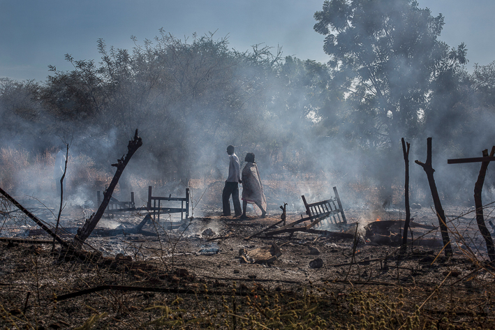 Le couple est dans le village de Kauda, le 21 novembre 2012. Le village vient d’être bombardé, les ruines sont encore fumantes. Le village est en cendres et les récoltes ont été détruites. C’est une situation classique dans un conflit : les populations civiles sont impactées et leurs ressources alimentaires aussi, ce qui va créer des situations de famine et d’exode.